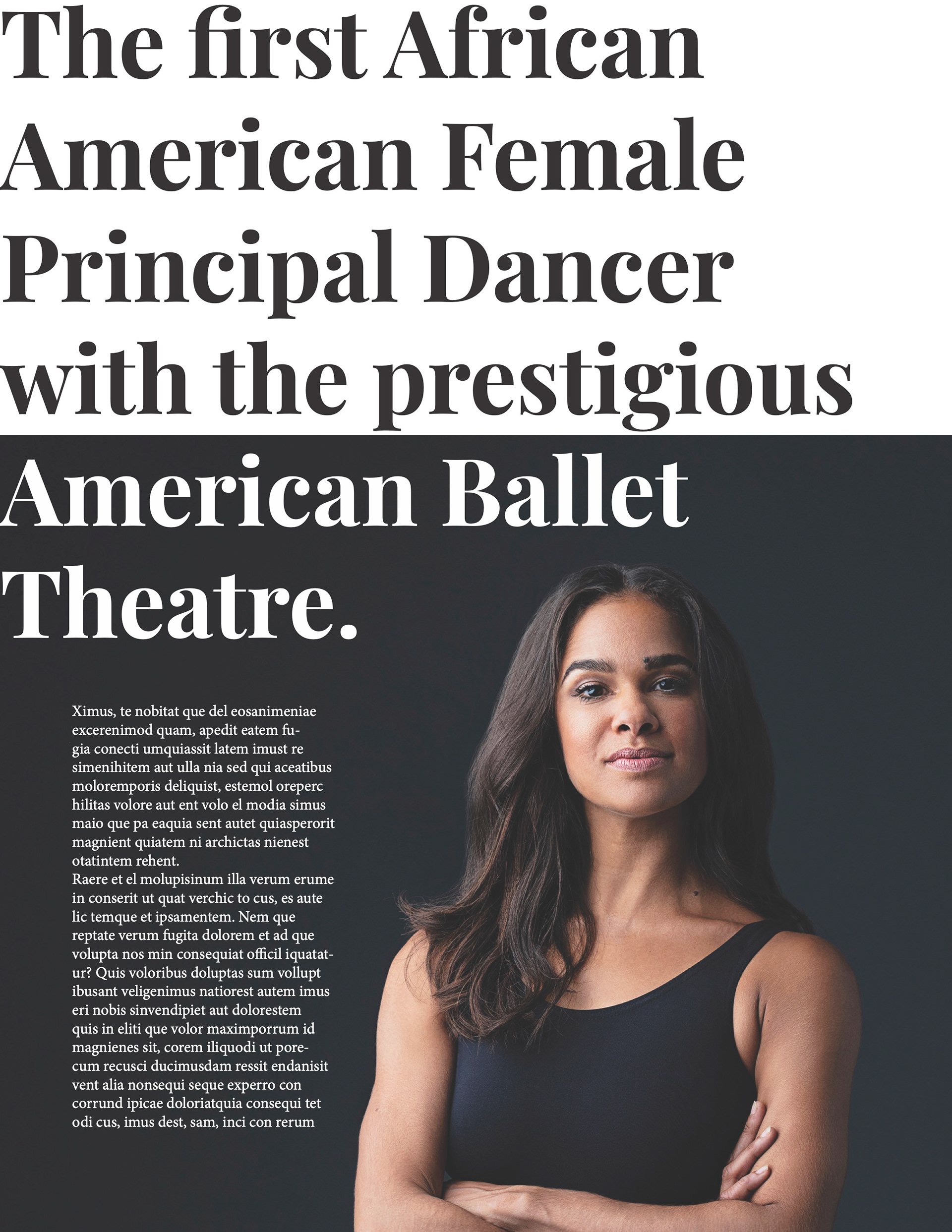 This magazine reimagines ballet through a modern lens, highlighting Misty Copeland as the first Black principal dancer at ABT and her impact on breaking barriers within the art form.